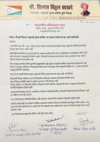 यावेळी पक्षाला दिलेल्या राजीनामा पत्रात म्हटले आहे की, ज्या गावात राष्ट्रवादी काँग्रेस पक्षाने उमेदवारी दिली त्या उमेदवाराला प्रचंड विरोध होता स्थानिक गावकऱ्यांनी तो वारंवार भोर राजगड मुळशीचे आमदार मांडेकर यांच्याकडे मांडला होता, मात्र कुठलाही सर्वे न करता कोणत्याही पक्षाच्या पदाधिकाऱ्यांना विश्वासात न घेता उमेदवारी देण्यात आली त्यामुळे त्यांनी आपला राजीनामा आज पक्षाकडे सुपूर्द केला आहे.